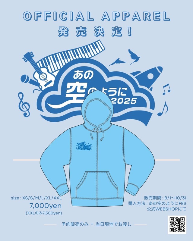 あの空のようにFES2025オリジナルパーカー 【郵送用】 受注生産・当日販売ナシ! XS〜XL:8000円(XXLは8500円) こちらは郵送専用となります。 郵送料込の値段とさせて致します。 よろしくお願いいたします。 #あの空のようにFES2025 #フェスグッズ